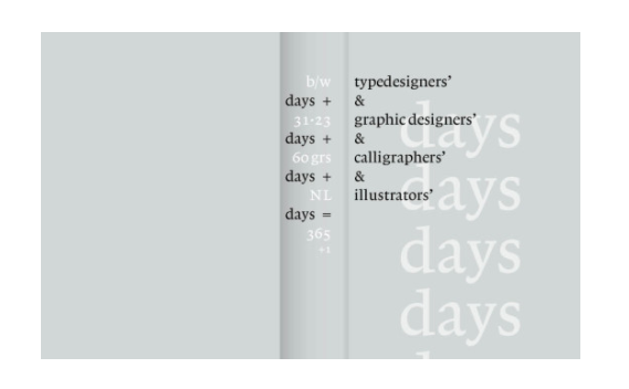 Je legt hem jaar in jaar uit op je bureau of tafel en dag na dag sta je versteld van het prachtige ontwerp van die datum, gemaakt door het beste wat Nederland te bieden heeft op het gebied van grafische vormgeving, letterontwerp, kalligrafie en illustratie. Talenten van toen, van vandaag en van morgen. 366 ontwerpers en illustratoren, 7 drukkers, 2 binderijen, 2 papierleveranciers, 2 kartonleveranciers en 1 leverancier van bandmateriaal maakten samen een uniek kalenderboek dat op 8 september zal worden gepresenteerd.