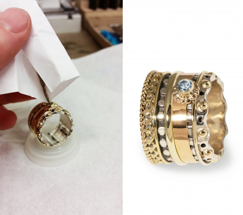 Als voorbeeld noemt jong een relatie, van wie beide ouders waren overleden. Ze verwerkte de trouwringen van de ouders in een nieuwe ring: ‘De ring is vervaardigd uit zilver en goud, waarbij de geelgouden smalle band in het midden is gemaakt van de trouwring van haar moeder. De gouden bolletjes aan de rand zijn gemaakt van de trouwring van haar vader. Onder de steen is een uitsparing gemaakt. Daarin is wat as van haar ouders verwerkt zodat de ring bijzondere emotionele waarde heeft gekregen.’
