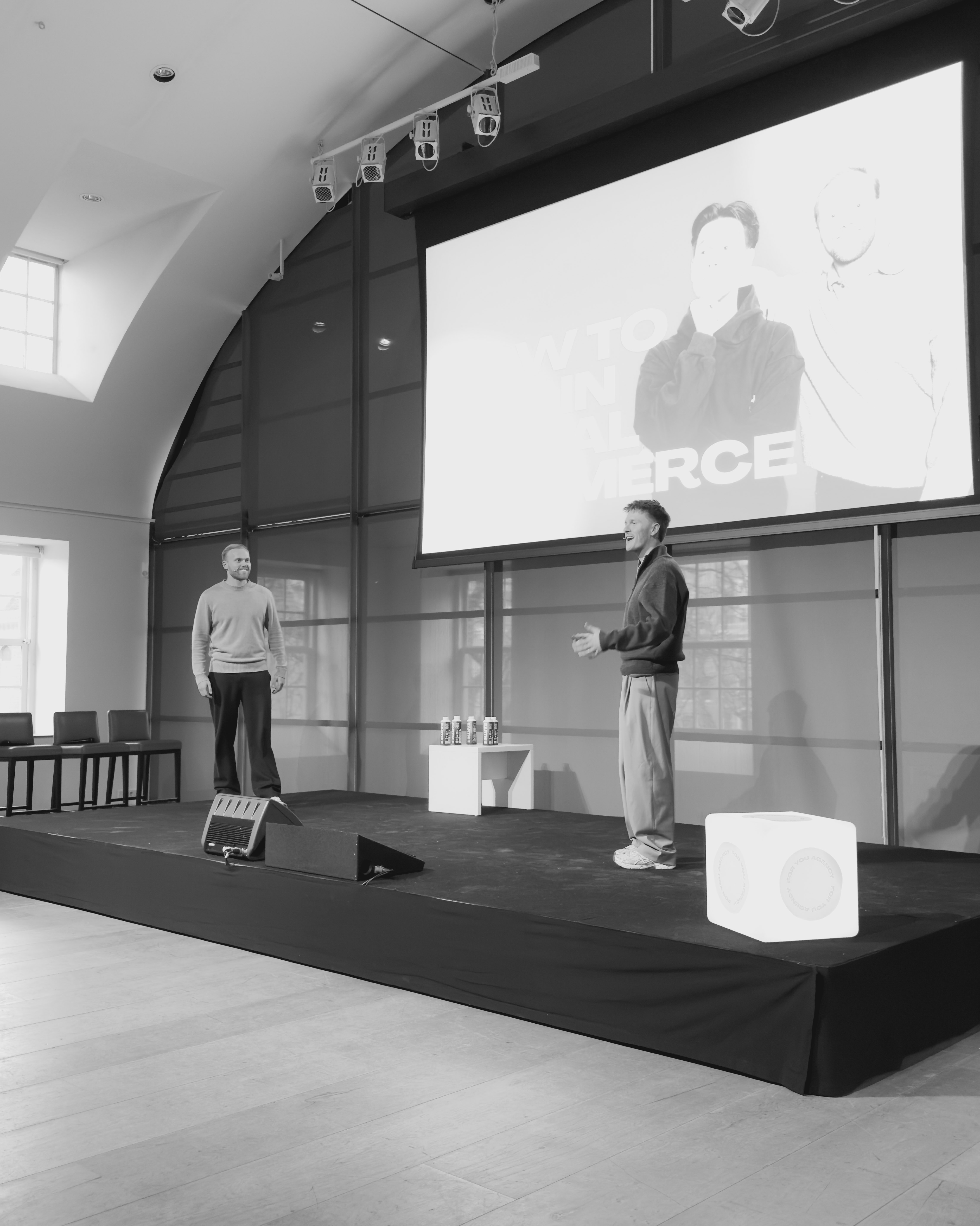 Een motiverende mannenstem kondigt de eerste talk aan, waarna For You Agency-oprichters Tess Scholten en Britt Messing onder enthousiast applaus het podium betreden. Onderwerp: The Future of Feeds.