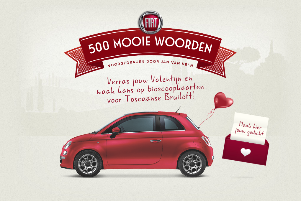 Op 14 februari is het Valentijnsdag. Daar horen mooie woorden bij. Fiat 500 gaat er dit jaar voor zorgen dat deze nóg mooier worden, door ze te laten voordragen door Jan van Veen, de man met de meest zwoele stem van Nederland. Saatchi & Saatchi | Leo Burnett is de creatieve motor achter de Valentijns-actie van Fiat 500.