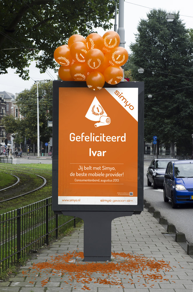 1500 verschillende abri's met namen van echte Simyo-bellers vullen de komende weken het straatbeeld in heel Nederland. Iets dat nog niet eerder is vertoond. In online advertising (op Nu.nl, Telegraaf.nl en Bellen.com) rouleren de komende tijd duizenden namen van echte Simyo klanten. En natuurlijk rouleren alle namen ook 24/7 op Simyo.nl.